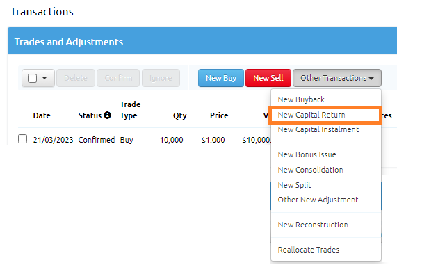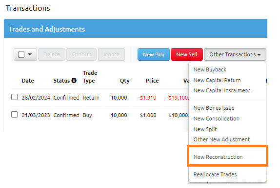 Next Click on “Other Transactions” and on "New Reconstruction" in the drop-down menu.