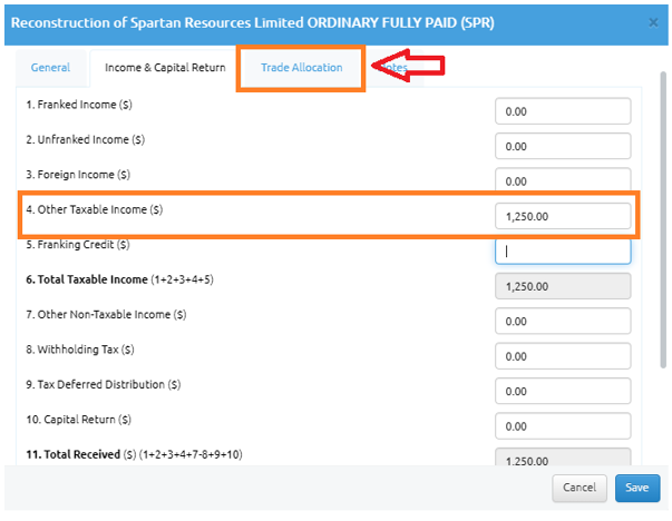 Next, click on the “Income & Capital Return” tab and enter in your Income of $0.25 per share, (ie. 5,000 shares X $0.25 = $1,250.00 ), into the “Other Taxable Income ($) column, as seen below: