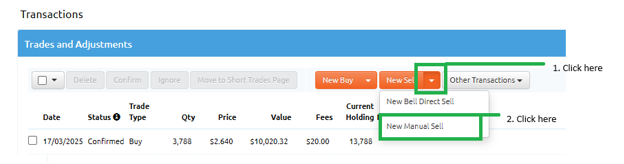**For members using the Bell Direct connection: Click the triangle at the end of the New Sell button, then select New Manual Sell from the drop-down menu.