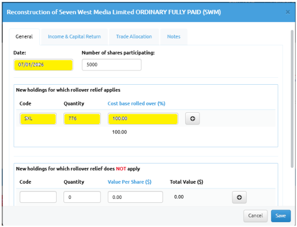 Click “save” and you have now accounted for the Scheme of arrangement for SWM.