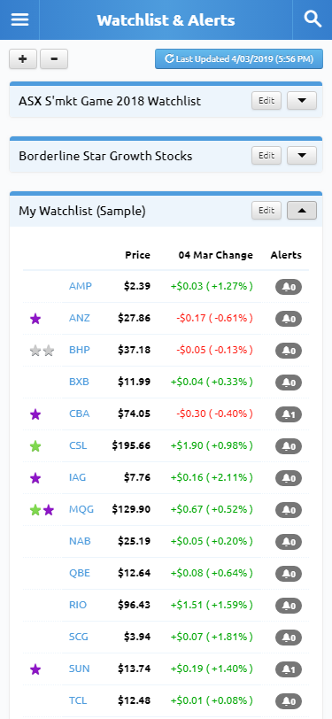 Provides you with an overview of triggered alerts and company movements. Simply click on the arrow to expand the list of stocks in a particular watchlist. On the left of the companies listed in your watchlists and portfolio holdings you will see a 'bell' icon with a number. The number on the bell indicates the number of alerts you have created relating to this company, if the icon is red this indicates an alert has been triggered.