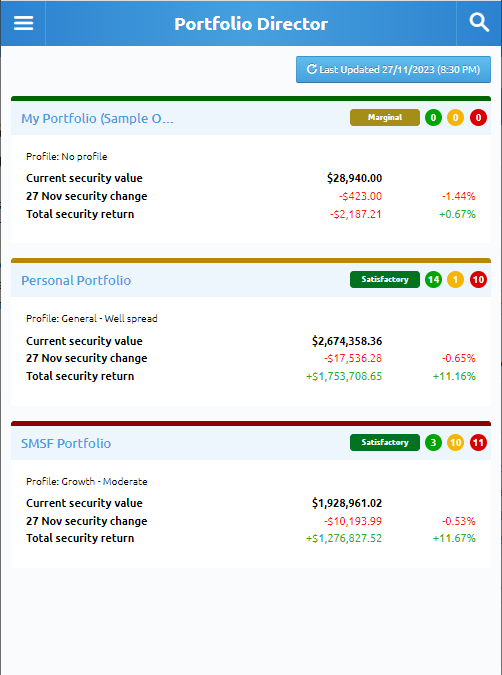 Provides you with a snapshot of your portfolios performance, alerts you to companies no longer meeting your investment profile and the health of your portfolio.