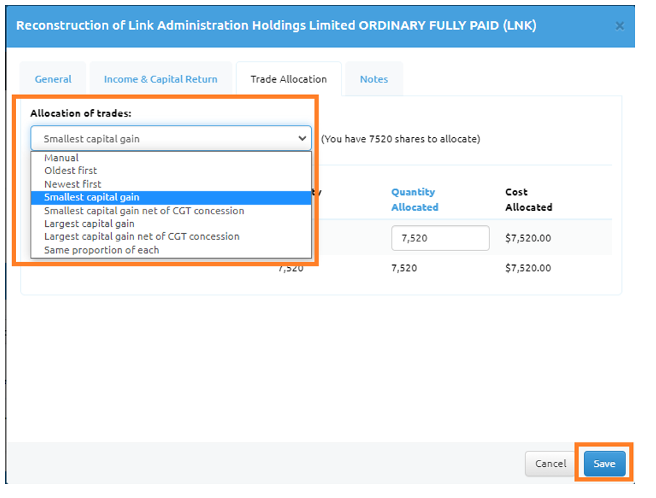 7. Click “Save” and you have accounted for the LNK/PXA reconstruction in the Portfolio.