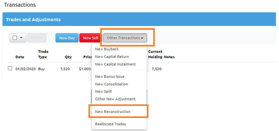 3. Please scroll down to the “Trades and Adjustments” area and click on ‘New Reconstruction’ under the "Other Transaction" drop-down menu.