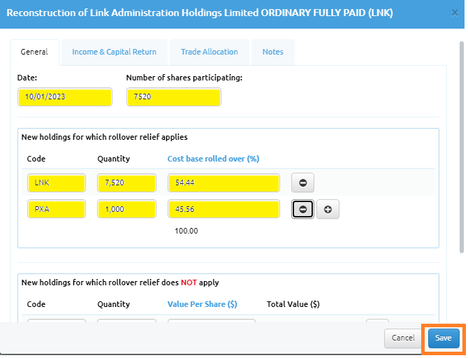 • Code: LNK, Quantity: same amount as “number of shares participating” and Cost base rolled over (%): 54.44%