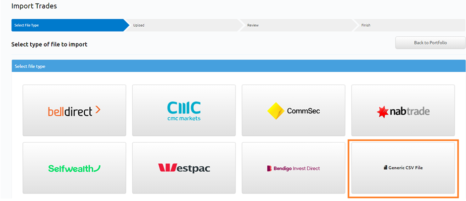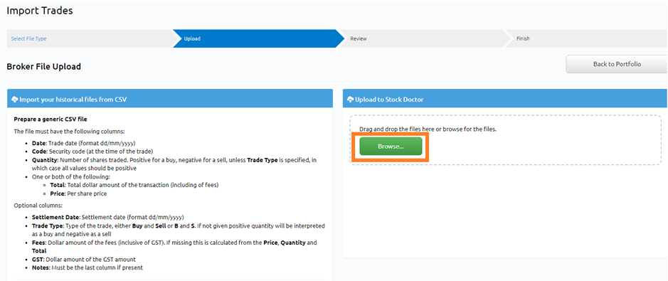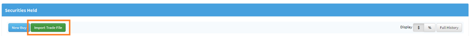 2. From the securities held screen, please click on the green button called “Import Trade File”