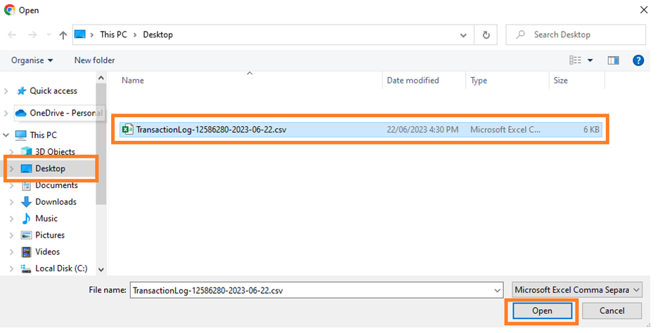 5. In the new window, on the left-hand side column click on “Desktop”, then in the middle of the screen, please click on the "file name" and it will be seen at the bottom of the pop out window in the ‘File Name’ area. Then, click on the “Open” button, found at the bottom right corner.