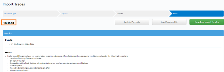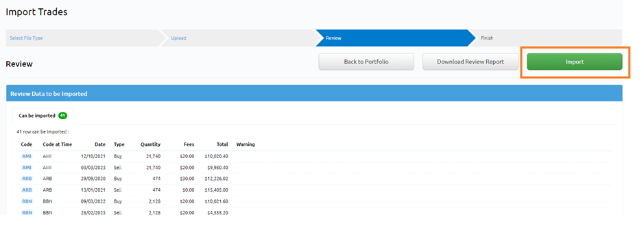 7. If there are any trades that cannot be imported you will be informed and they can be corrected before importing.