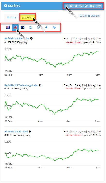 - Improved Markets Panel, bringing back market charts. You can now switch between table and chart views. Access market charts across a range of financial landscapes directly from the home page. Chart the trends of international market movements, along with US and Australian futures markets, commodities, forex trends, and Bitcoin movements. The new market charts view provides easy-to-read charts with intuitive market icons, allowing you to quickly switch between different market landscapes across selectable time periods.