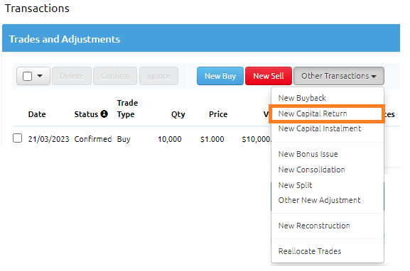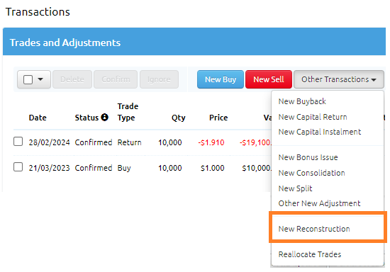 - Click on “Other Transactions” then on ‘New Reconstruction”